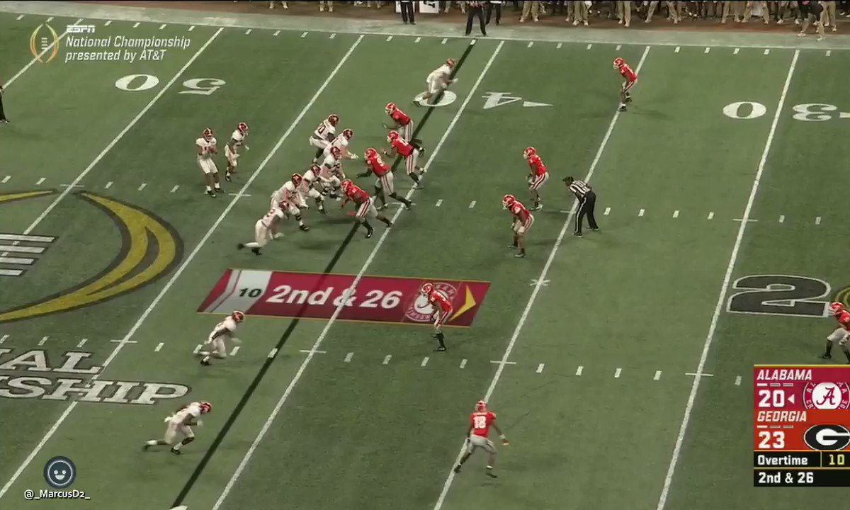 Chubb ran up the middle for 7 yards, getting the Bulldogs to 3rd-and-11, and Fromm aggressively threw deep to Hardman on the sideline. The sophomore wide receiver fought past the coverage for the long touchdown and the play stood up to a review by officials.